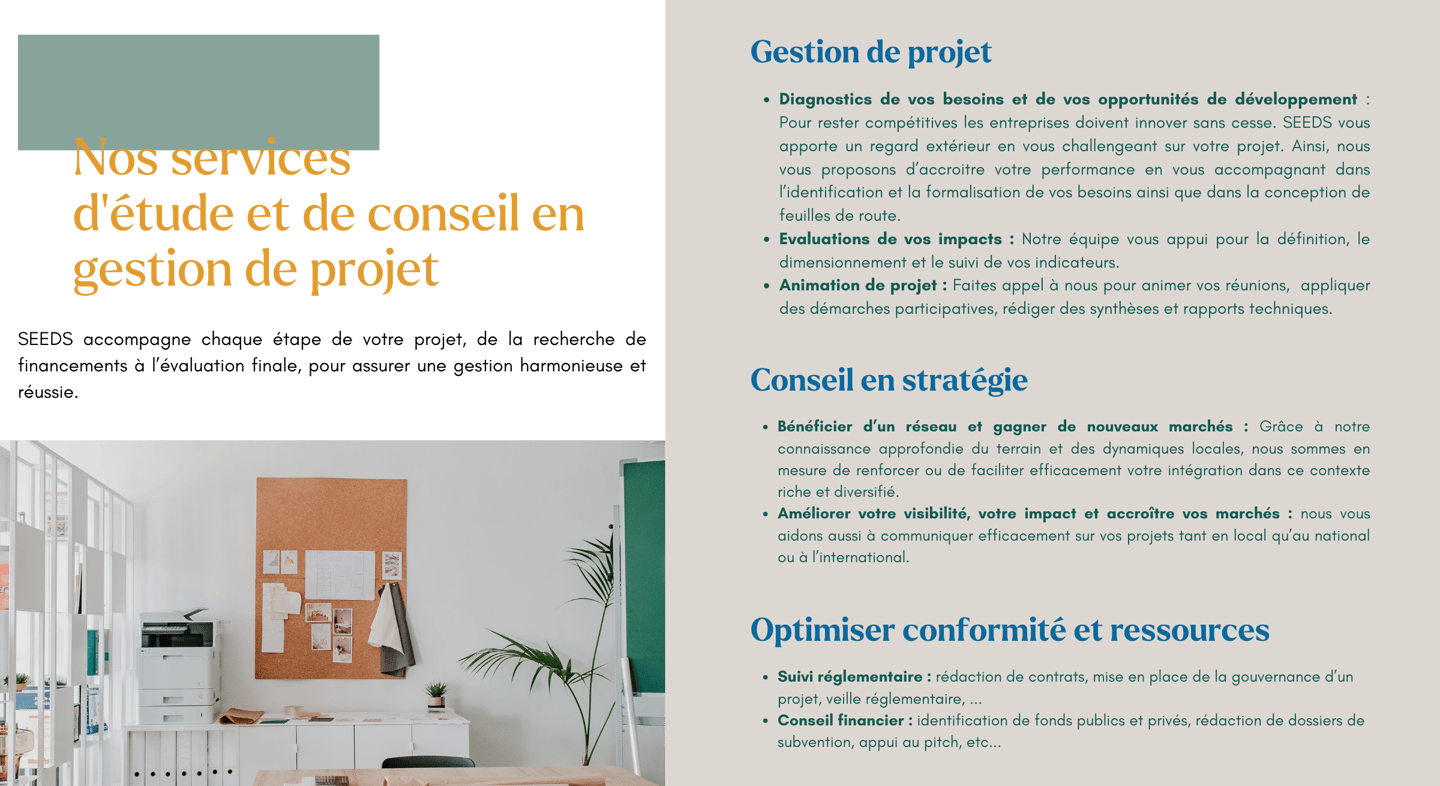 En outre, SEEDS apporte une contribution significative aux initiatives des institutions publiques telles que les universités, les centres de recherche et les collectivités. Nous nous engageons à collaborer étroitement avec ces entités pour fournir une assistance technique et stratégique, notamment en répondant aux appels à projets. Notre expertise diversifiée et notre capacité à comprendre les enjeux complexes nous permettent d'apporter des solutions innovantes et efficaces à divers types de projets.